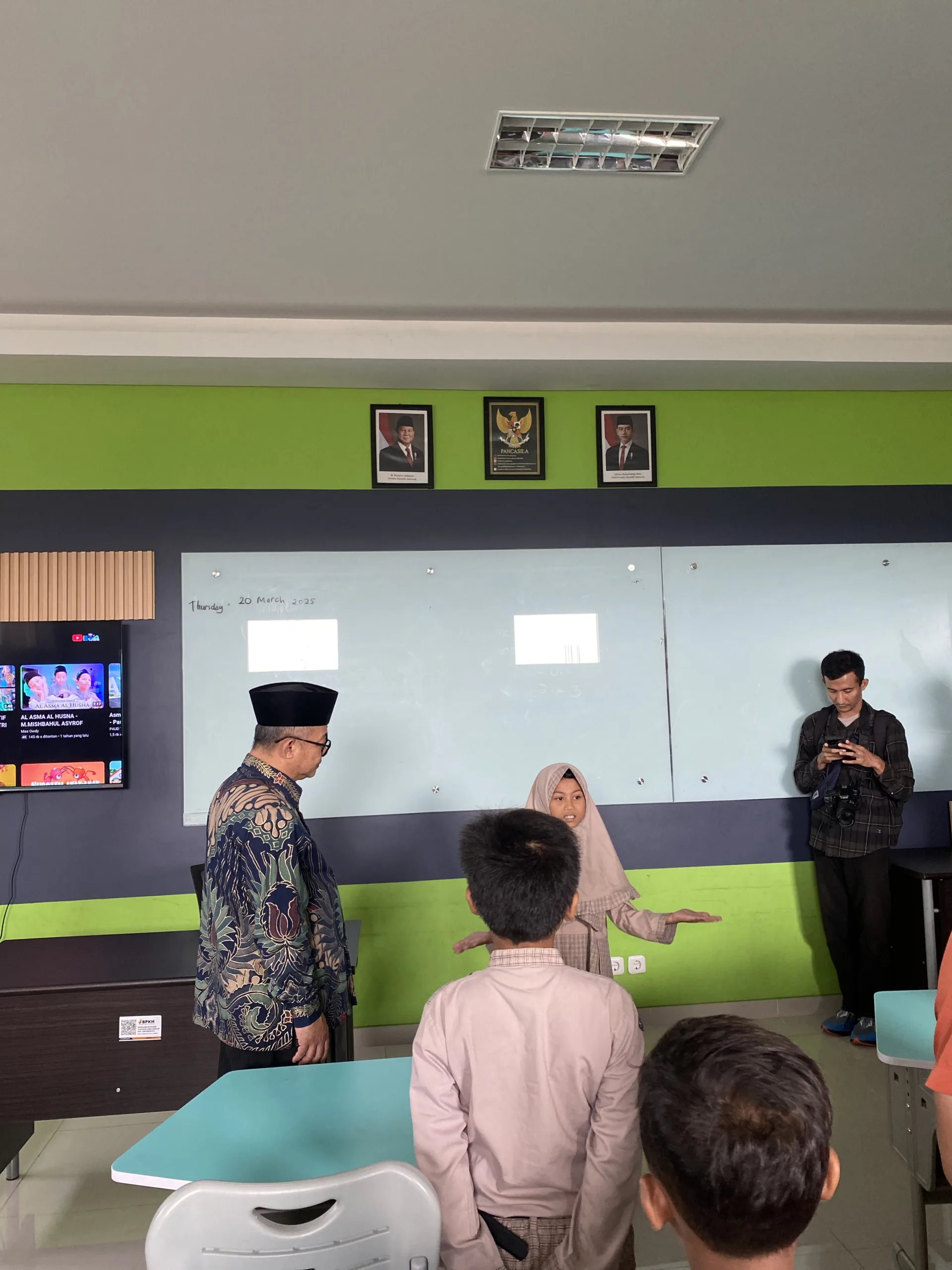 Pada waktu itu anak-anak sedang menghafalkan Asmaul husna beserta artinya yang ditayangkan guru di Smart TV.